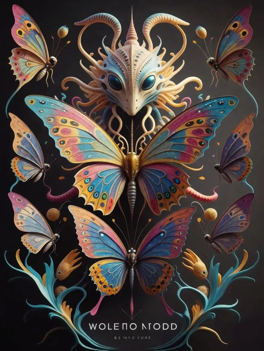 Explore surreal alien butterflies inspired by Ernst Haeckel and Walton Ford. This AI-generated 8K artwork features hyper-detailed, vibrant creatures with sharp lines and vivid colors, arranged in a mesmerizing tableau. Immerse yourself in a living art exhibit of intricate alien wonders, rendered in stunning 2D perspective for a captivating visual experience.