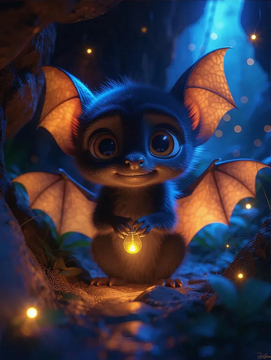 Create a cute baby bat character rendered in iconic Pixar 3D animation style with vivago.ai. Generate adorable cartoon bats easily using AI prompts. Transform text descriptions into professional, heartwarming AI-generated art instantly.