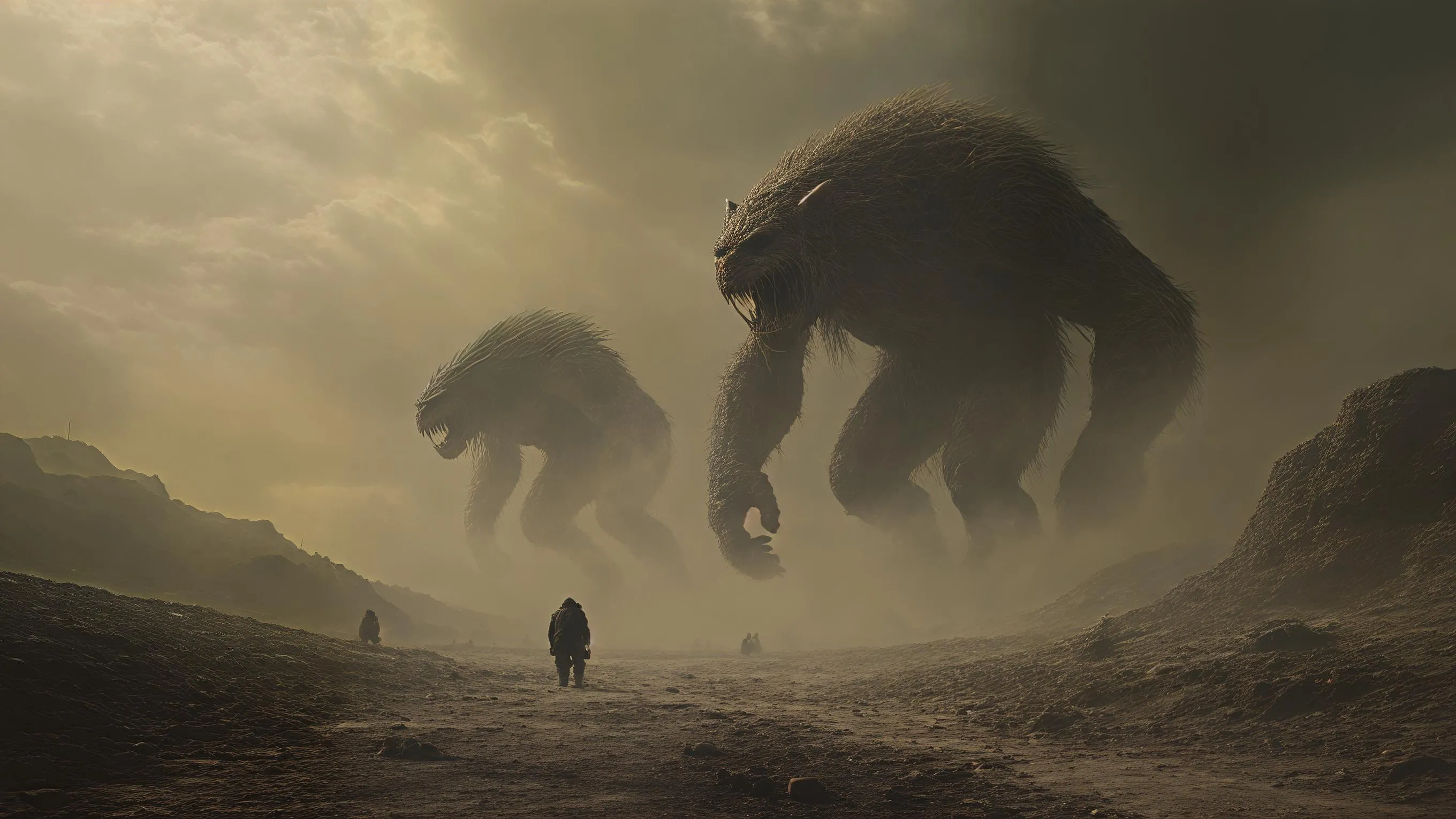 Generate AI images of giant beings vanishing from reality, fading into dust and shadow. Dark cinematic mythological atmosphere depicting a scarred, silent world. No triumph, only necessity and finality. Create professional AI art with Vivago.ai's tools.