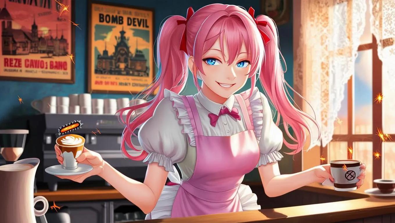 Generate vibrant anime illustrations like Reze in a cozy café scene with AI. Create detailed character designs, latte art with chainsaw foam, and subtle bomb devil energy sparks using professional-grade AI tools. Perfect for dynamic anime visuals blending sweetness and danger.