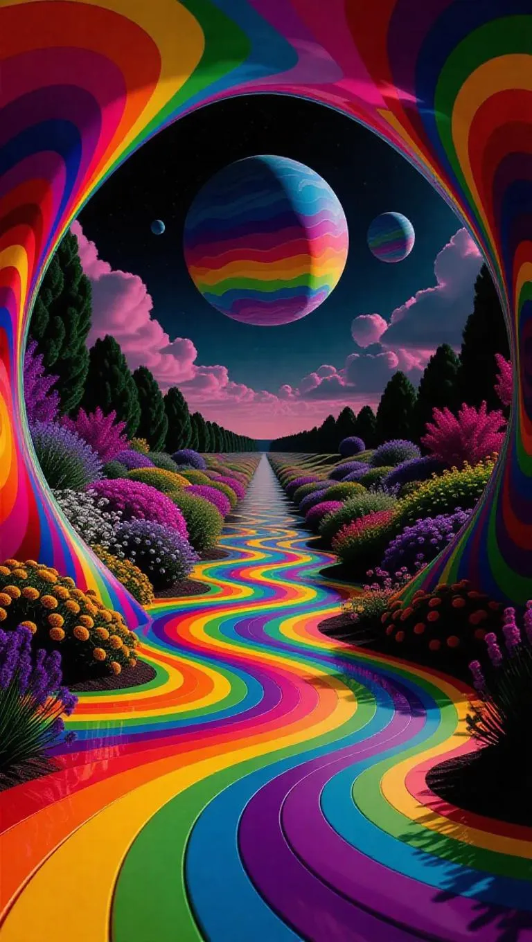 Explore a surreal AI-generated psychedelic garden with morphing collages, liquid oil projections, and horror vacui style. HD render of outer space cartoon rivers, phosphenes, and avant-garde light art blending positive-negative spaces. Transform prompts into vivid, detailed visuals using vivago.ai's AI effects for mesmerizing, nature-inspired surrealism.