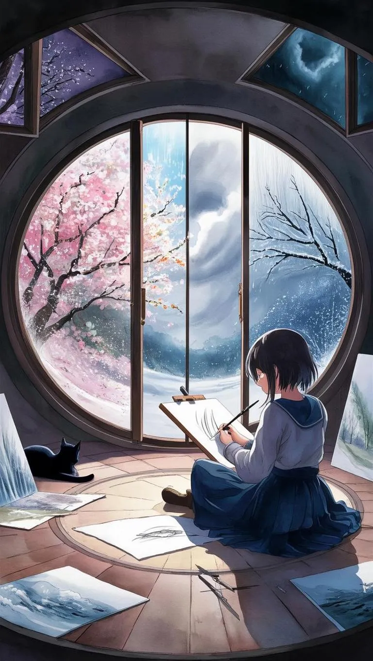 Transform text into cinematic anime art with Vivago.ai's AI image generator. Craft fluid, watercolor scenes of shifting seasons, introspective moments, and impermanence motifs. Generate ethereal visuals—spinning windows, shadow cats, evolving brushstrokes—in dynamic hues. Ideal for anime-inspired, watercolor storytelling with cyclical, cinematic flair. #Anime #Cinematic #Watercolor