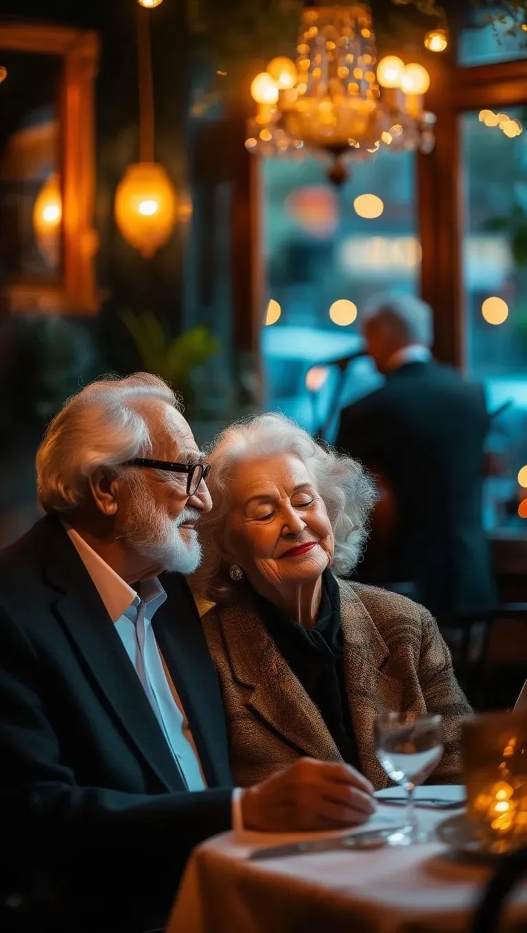 Generate a touching AI image of an elderly couple savoring a live jazz performance in an intimate restaurant setting. Use vivago.ai’s advanced text-to-visual tools to craft vibrant lighting, expressive details, and atmospheric depth for professional-grade creative results.