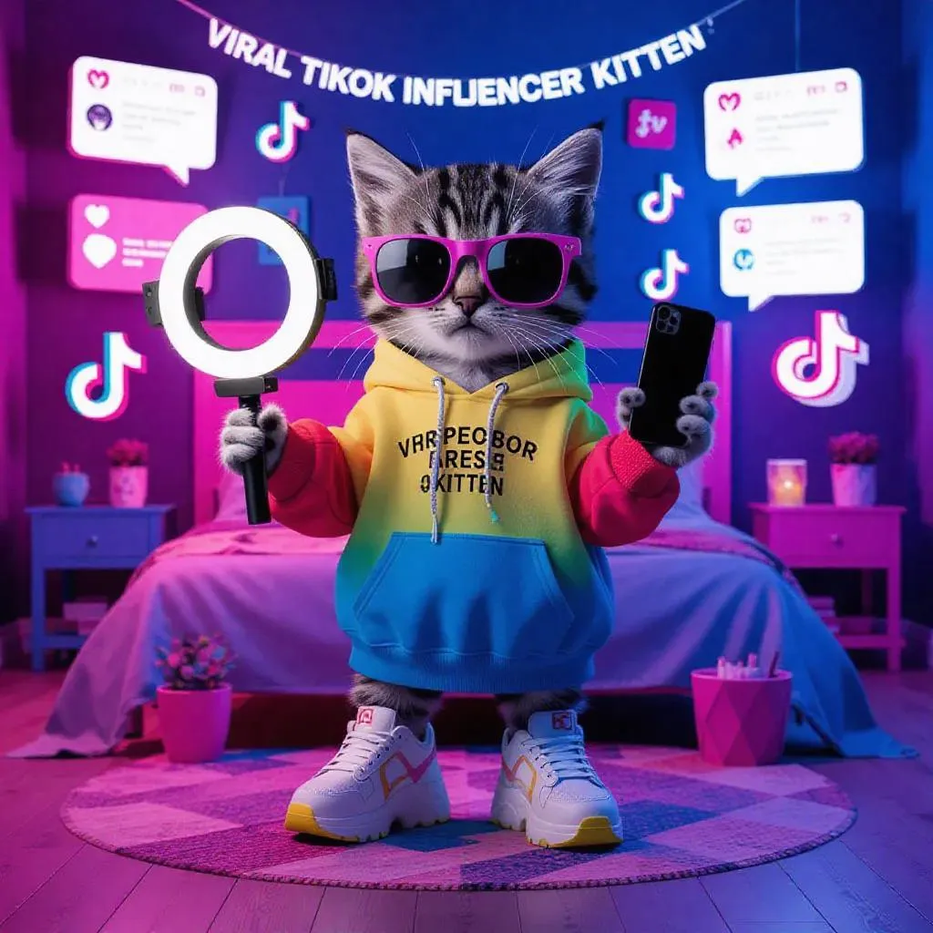 Create viral TikTok-ready AI-generated images with a hyper-realistic 16K kitten influencer in a neon-lit bedroom, wearing trendy sunglasses, a colorful hoodie, and chunky sneakers. Featuring ray tracing, 3D rendering, and vibrant props for eye-catching, shareable content designed to stand out on social media.