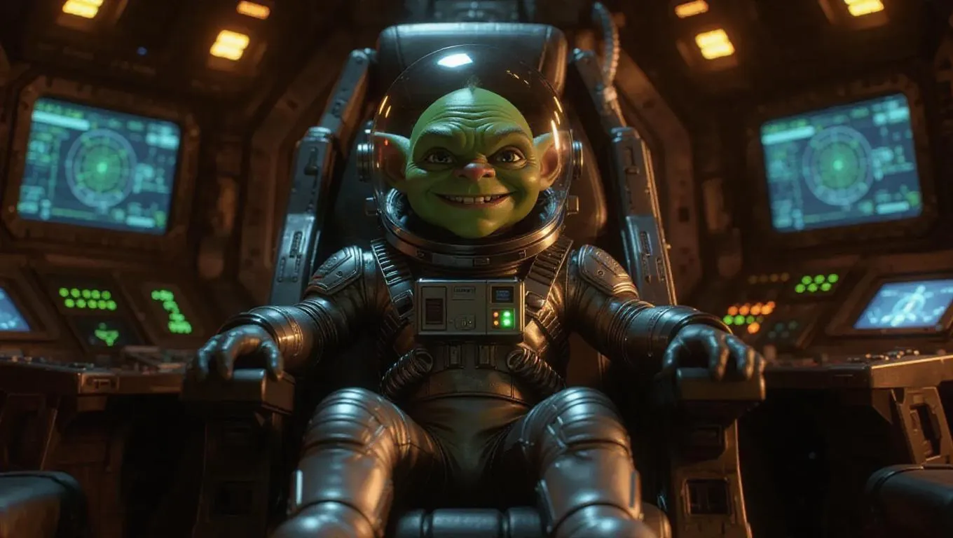 Generate a whimsical AI image of a grinning green goblin in a sleek silver spacesuit and transparent helmet, perched on a futuristic control chair surrounded by sci-fi monitors and gadgets. Transform text prompts into vivid visuals with VivaGo.ai's AI tools for professional, imaginative content creation.