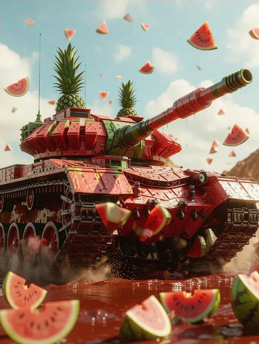 Generate a surreal fruit battle tank with watermelon armor, pineapple spikes, and mango cockpit using AI. Vivago.ai transforms prompts into vibrant, dynamic scenes—explosive textures, rear-view symmetry, and organic vibrancy. Craft juicy military might with dragon fruit turrets, kiwi gears, and passionfruit clouds. Perfect for surrealism and professional-grade AI art.