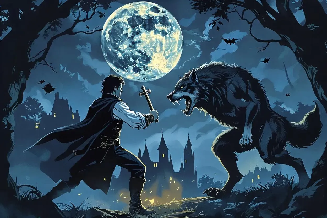 AI-generated art of a young Abraham Van Helsing in his mid-20s battling a ferocious werewolf. Experience dynamic horror scenes blending supernatural action and dark fantasy elements. Create intense monster-hunting visuals with AI-powered tools for realistic textures, dramatic lighting, and cinematic storytelling. Perfect for horror enthusiasts and digital artists seeking edgy, supernatural character designs.