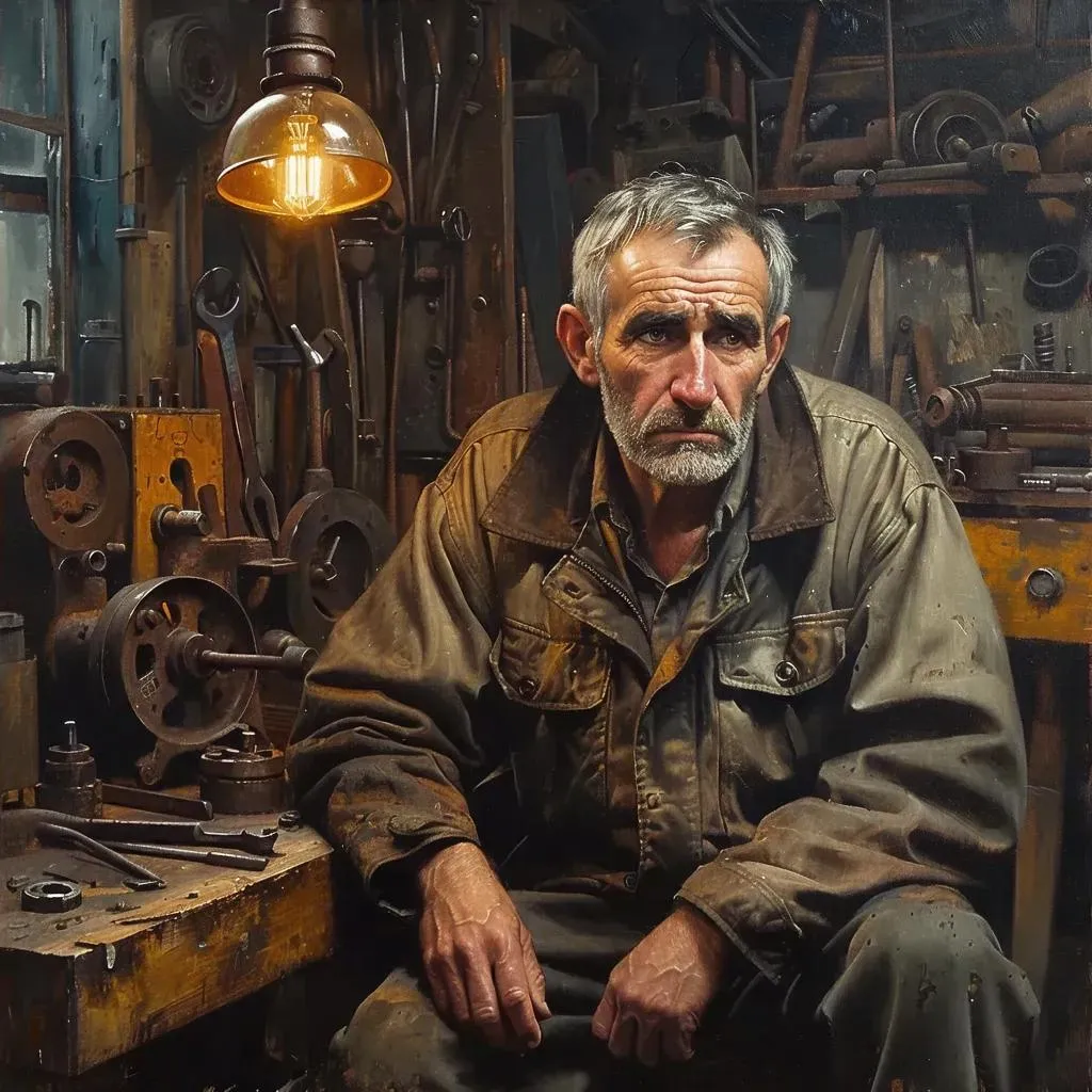 Capture the poignant solitude of an aged mechanic in a worn jumpsuit, lost in thought amidst tools and foggy workshop vistas. Vivago.ai's AI image generator crafts evocative scenes with professional-grade effects, transforming text prompts into atmospheric visuals of despair and muted melancholy.