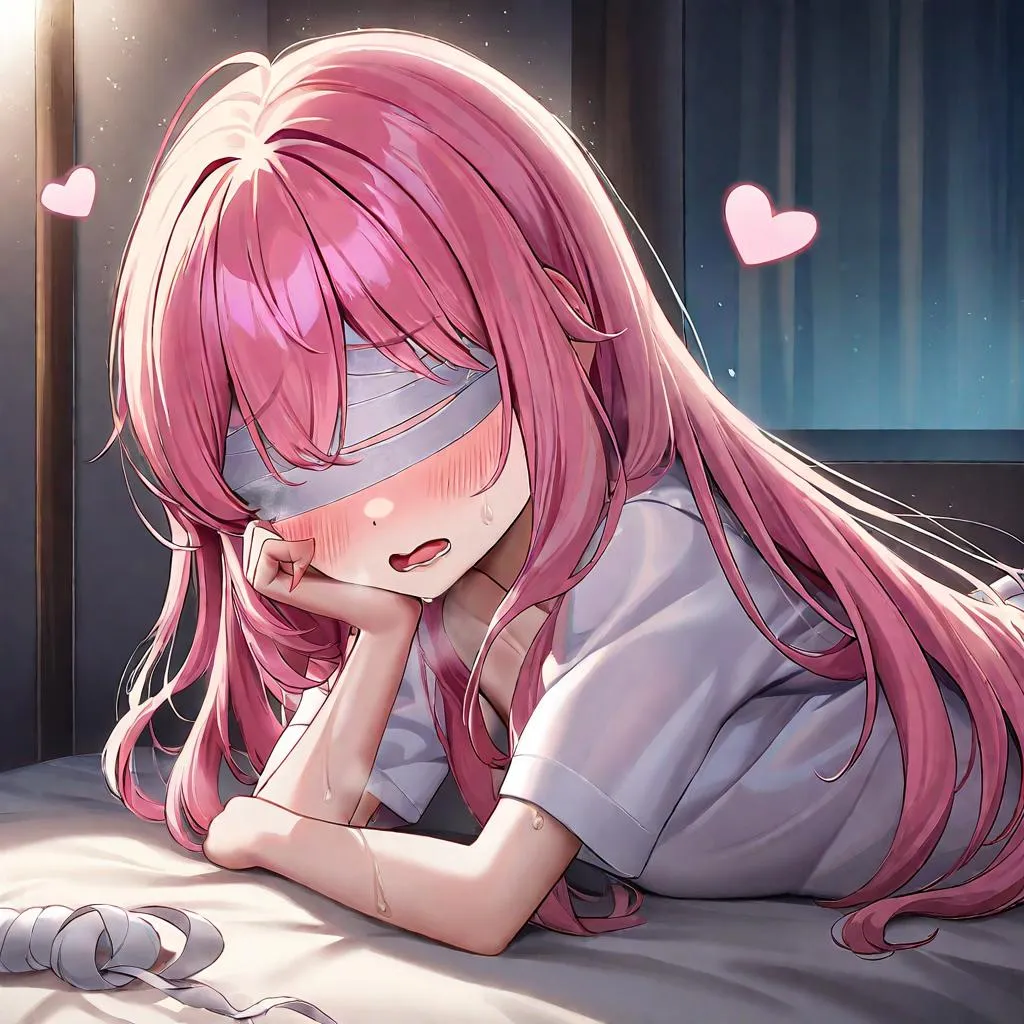 Generate an emotional AI image of a crying pink-haired girl with bandaged eyes in a dark room using vivago.ai. Transform text prompts into striking visuals with AI effects, professional editing tools, and mood-driven lighting for evocative, high-quality creative results.