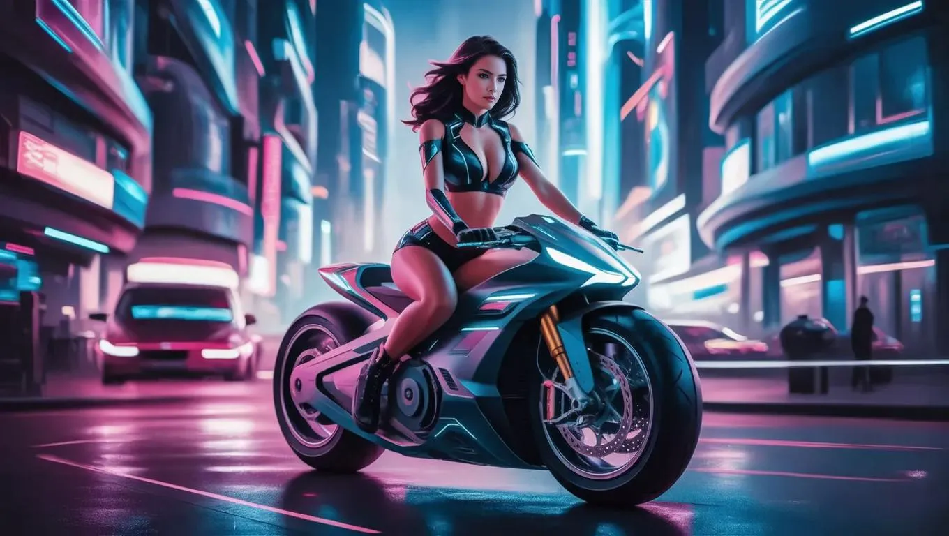 Generate TRON-inspired AI art of a stylized female rider on a neon lightcycle in a cyberpunk metropolis. Explore vibrant neon-lit cyberspace visuals with full-body composition, futuristic aesthetics, and dynamic AI-generated effects for cutting-edge digital artwork and cybernetic character design.