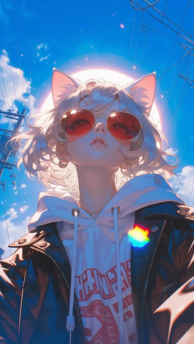 Prompt: A dynamic low-angle selfie of a stylish young person with short, light-colored hair, wearing cute cat ears, red-tinted sunglasses, and layered street fashion, including a hoodie and a patterned jacket. The sun behind their head creates a bright halo effect, casting dramatic, colorful lens flare and light leaks. The background features a brilliant blue sky with wispy clouds and crisscrossing power lines, adding an urban edge. Shot on a wide-angle lens, the image has a Japanese street photography aesthetic, high energy, and a dreamy, vibrant color grading