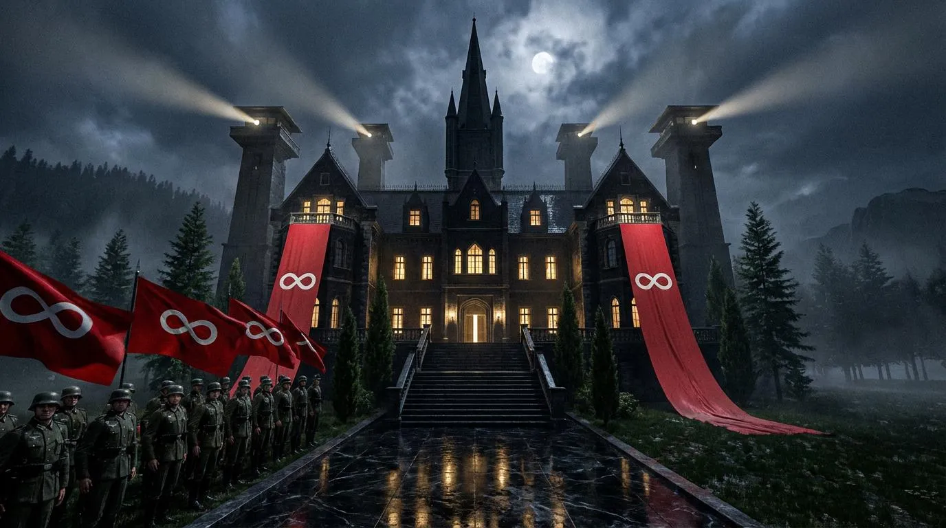 Generate haunting AI visuals: ultra-wide Gothic mansion with infinity-sign banners, sentry towers, and 1940s German soldiers on wet marble walkways. Create dramatic night scenes featuring red flags and towering architecture using vivago.ai's AI image generator tools. Transform text prompts into professional-grade dark fantasy imagery effortlessly.