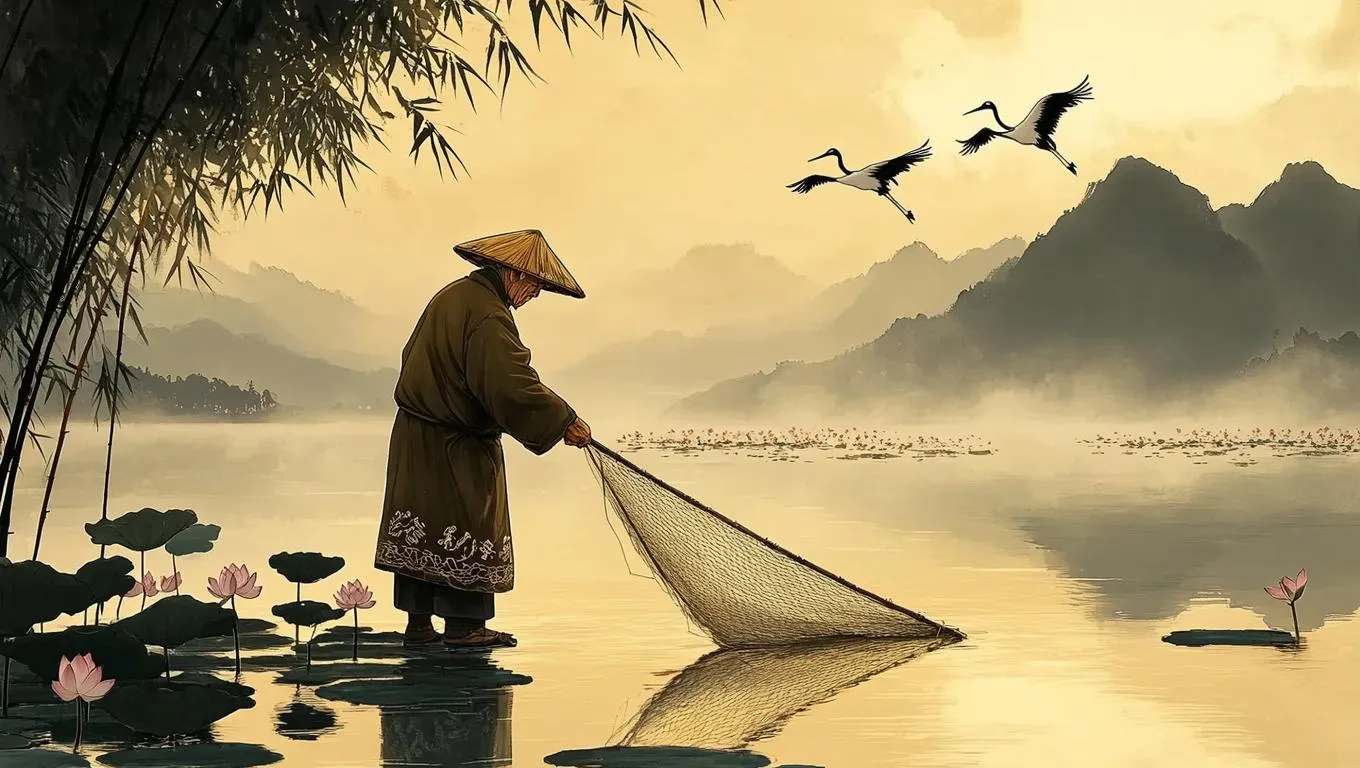 AI-generated Chinese classical art depicting an elderly fisherman in a bamboo raincoat casting a net on a misty lake. Ink-wash textures meet anime-inspired aesthetics, capturing serene reflections, gliding cranes, and dawn's golden light. Experience tradition with dynamic energy and poetic balance through AI image generation. #TraditionalChineseInkPainting