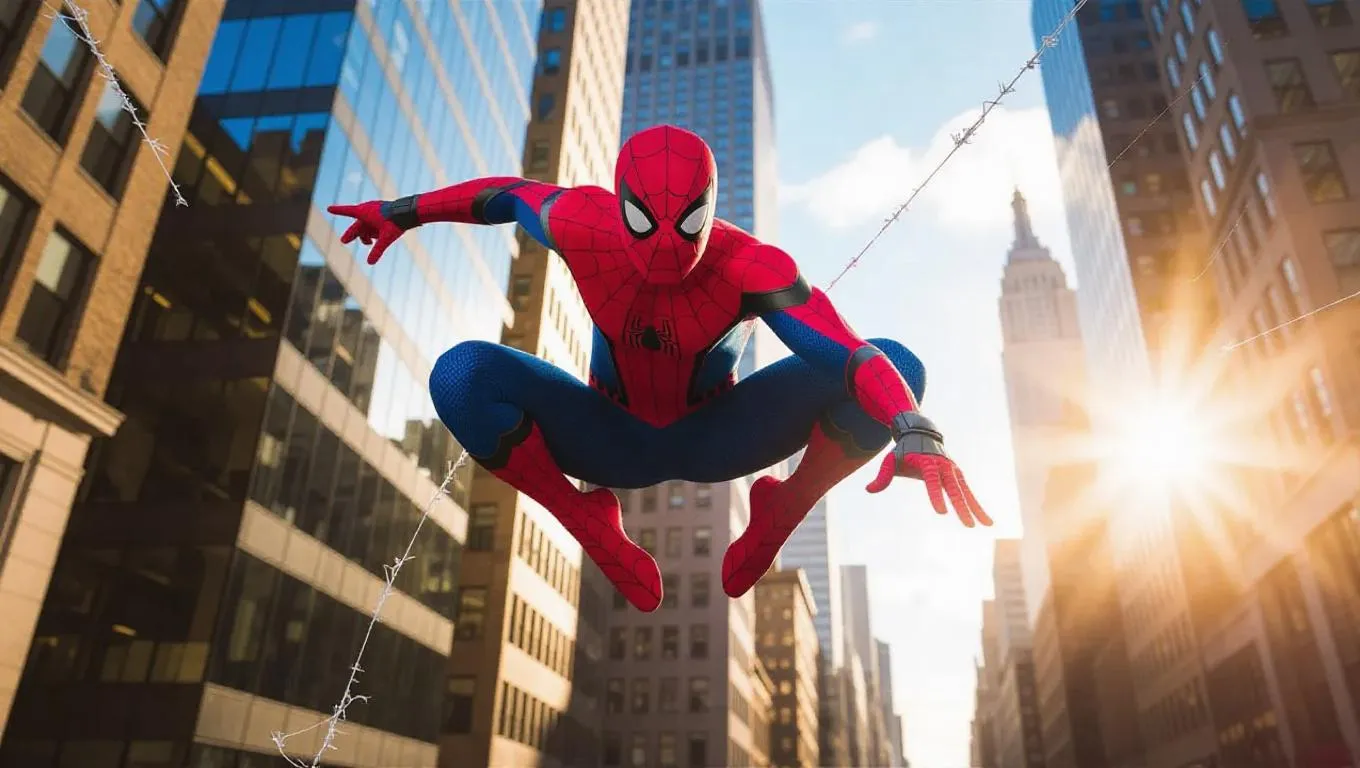 Vibrant AI-generated image of Spider-Man swinging through New York City skyscrapers, golden morning light illuminating his classic red-blue suit in a dynamic mid-air leap. Capture web-swinging action, clear skies, and vivid cityscape details. High-energy superhero art with tiny cars emphasizing scale—AI-powered creativity for stunning visuals.