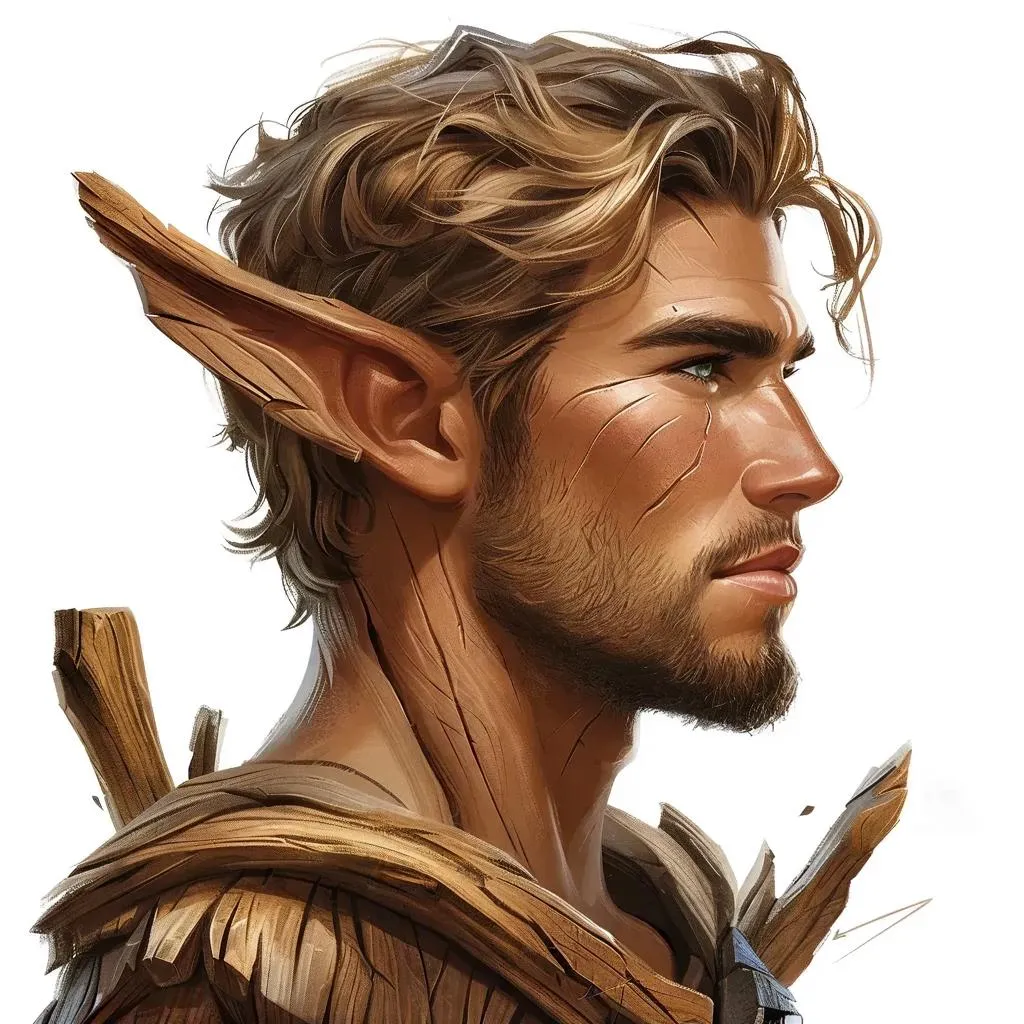 Create AI-generated fantasy character art with a male wooden-skinned figure in close-up profile. Hand-drawn style highlights intricate wood textures, shoulders, and facial details on a white background. Ideal for fantasy illustrations, RPG visuals, or mythical storytelling. Transform prompts into professional digital artwork using Vivago.ai's AI image tools.
