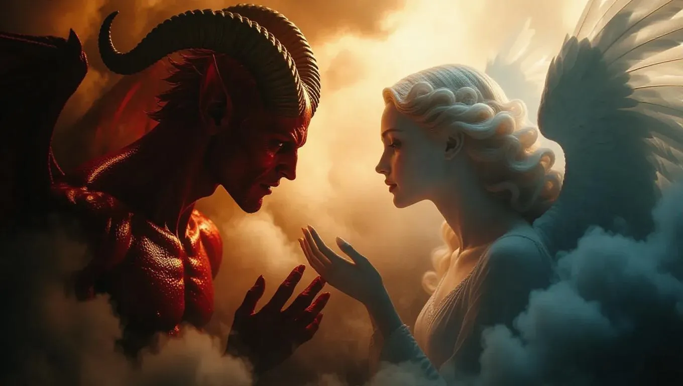 A diabolical devil and a serene angel engage in a cryptic conversation, hovering amidst swirling, iridescent cloud formations resembling cauliflower blooms, warm golden light seeping through gaps, casting an ethereal glow. Devil's crimson skin glistens with dew, horns twisting upward like ram's, angel's porcelain complexion radiates purity, wings unfolding like a lotus flower. Soft, feathery cirrus clouds drift by, surreal high-contrast scene, magazine cover quality, airbrushed hyper-realistic, fantastical dreamscape.
