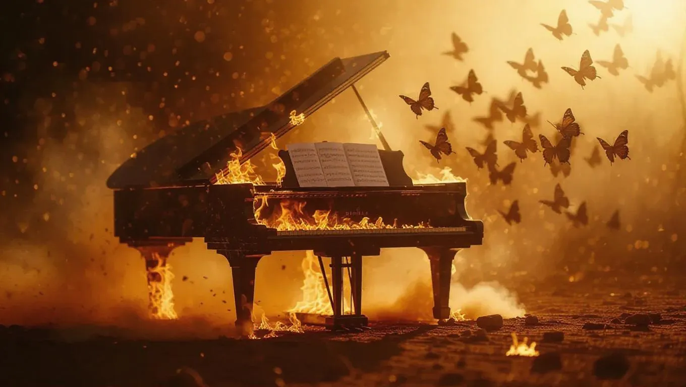 A concert piano burning in the middle of a desert, strings bursting with intense sparks, sheet music pages converting into ash butterflies. Harsh chiaroscuro lighting, swirling golden ember particles in the wind.