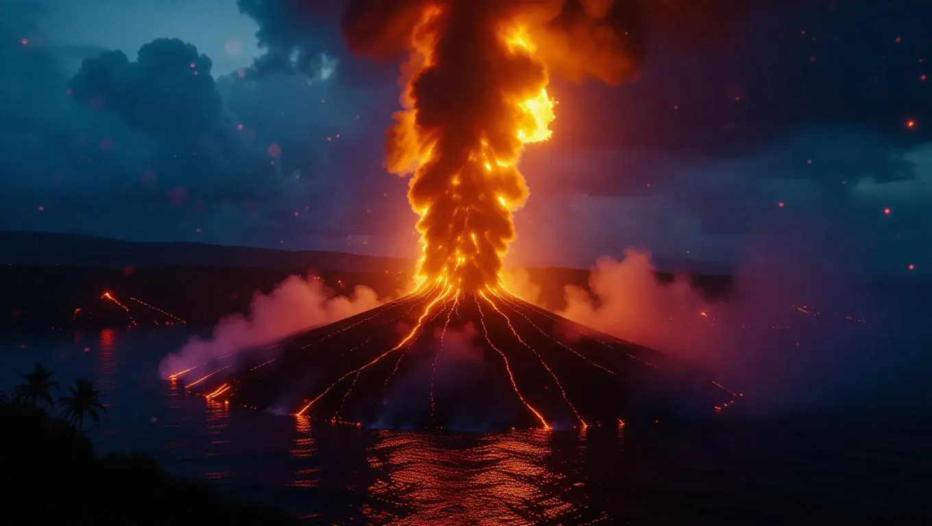 An enormous fire tornado sweeping across a volcanic island, floating embers, vivid lighting, cinematic havoc, hyper-realistic flames