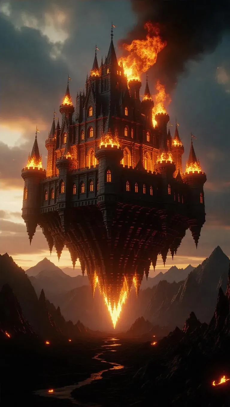 Text to ImageA massive floating castle made entirely of fire, its walls brimming with blazing flames, hovering over a landscape of charred earth, epic fantasy, high detail, ultra-HDRecreate