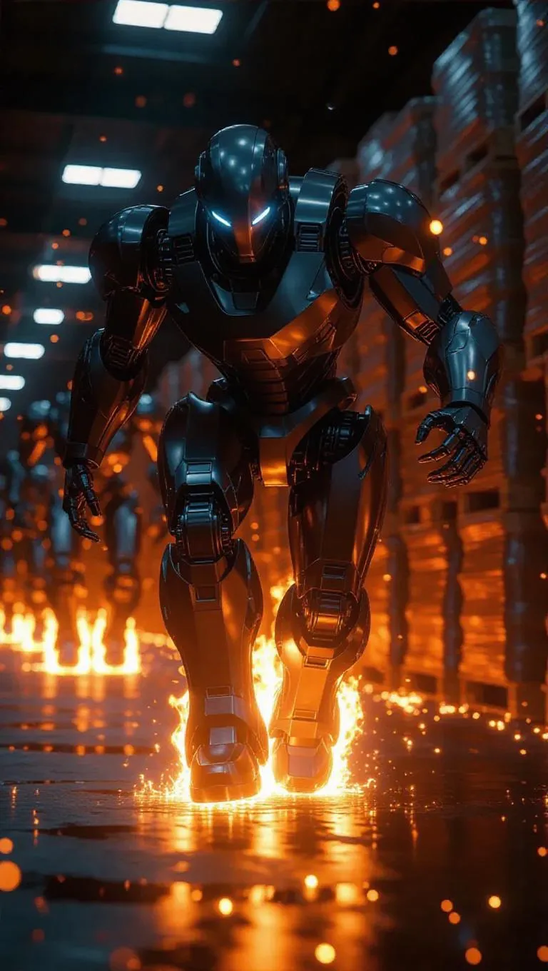 Robotic firefighters with sleek silver skin battling sentient flames in a warehouse, sparks flying over burning pallets. Dynamic mecha combat scene, chrome reflections distorted by heatwaves, with a robot engulfed in flames.