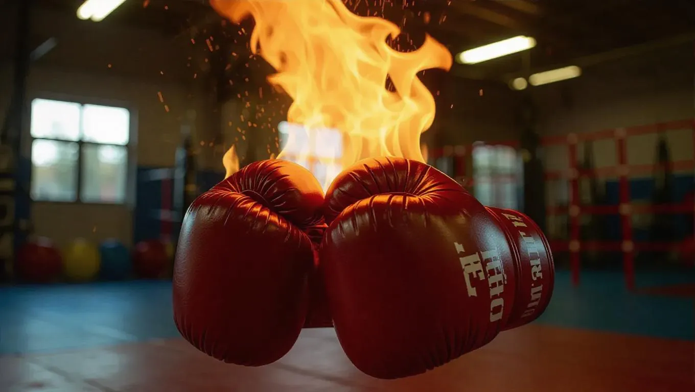 Text to ImageA pair of oversized boxing gloves suddenly catches fire during a playful training session in a kids' gym, the flames spreading across the leather, the scene illuminated by the glow of the burning gloves.Recreate