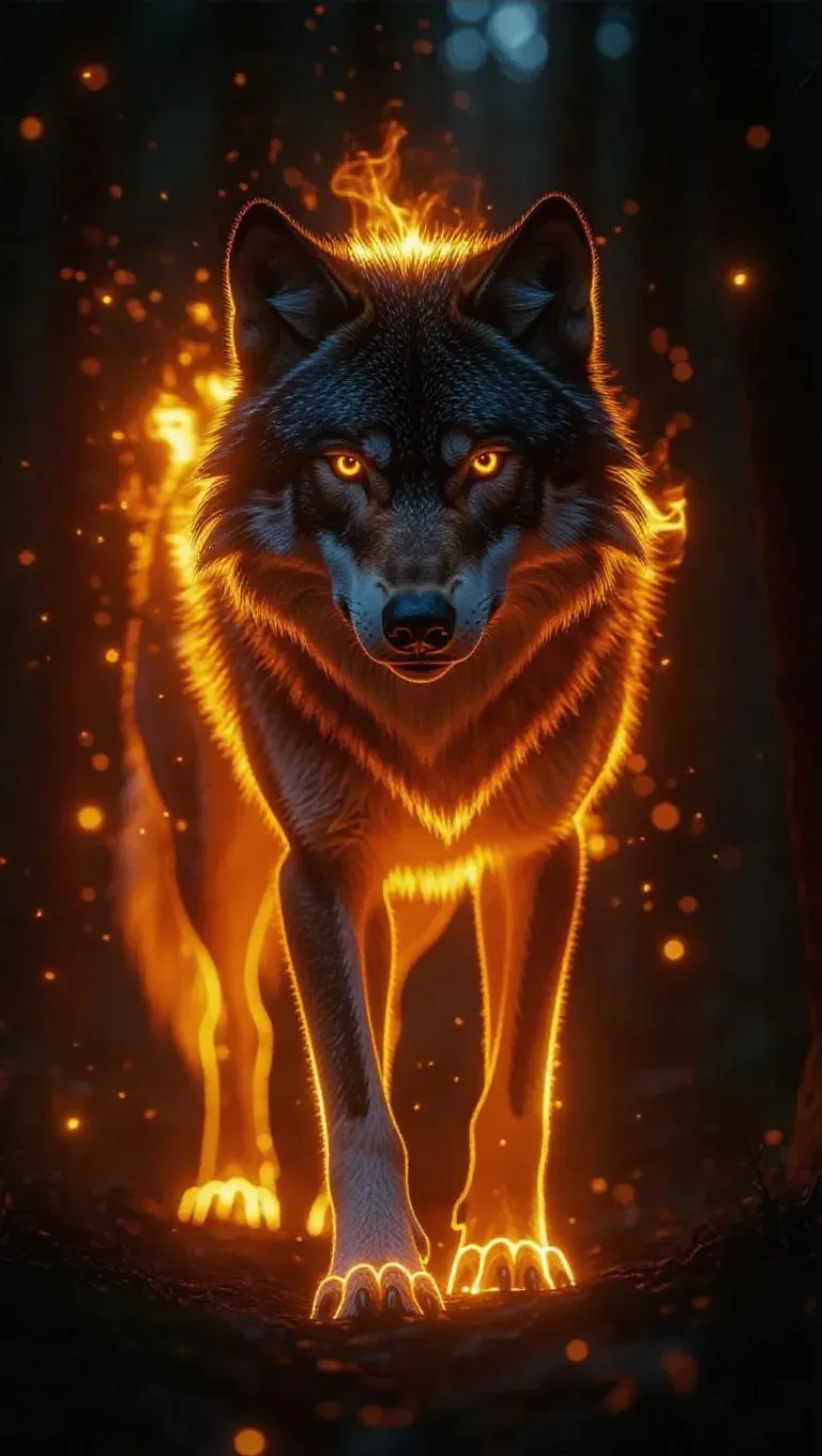 A majestic wolf composed entirely of flames, standing beside a glowing portal in a dark enchanted forest, glowing eyes, sparks trailing its movements, hyper-realistic, cinematic lighting.