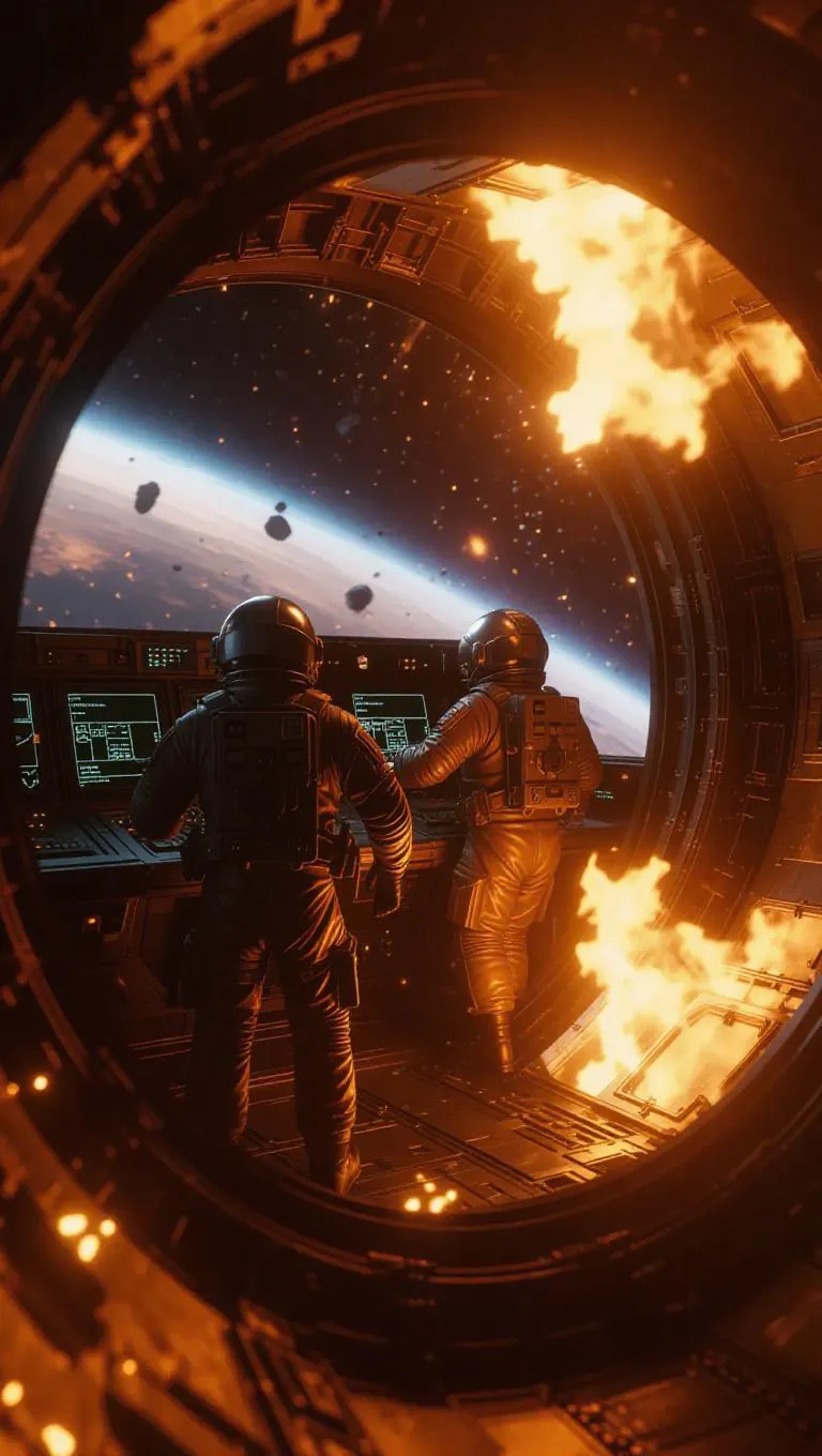 In the vastness of space, a cargo space station is ablaze. The outer hull is pockmarked from violent blows, with flames and sparks shooting out into the cold vacuum. Inside, the cramped corridors are filled with thick smoke and fire, with astronauts in worn emergency suits trying to control the disaster. The control room is chaotic, with screens blinking and alarms echoing. The windows open to the vastness of space, with a distant asteroid belt visible, a stark contrast to the fiery chaos within. The station’s thrusters fire sporadically, trying to stabilize the structure, but the flames continue to spread, threatening to consume everything.
