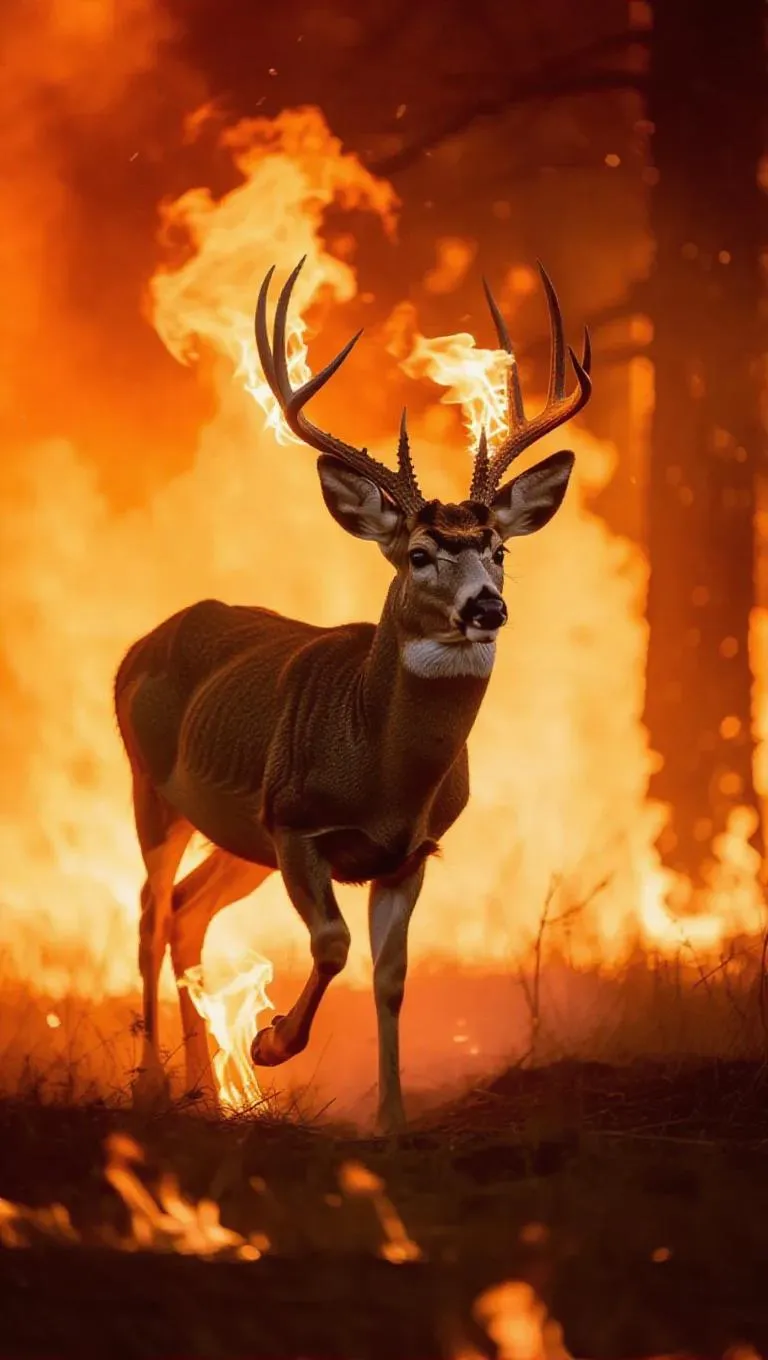 a mule deer dashing through a California wildfire, its hindquarters engulfed in licking amber flames. Use a Phantom Flex 4K at 500fps to capture individual hairs igniting and curling upward. Dynamic inferno lighting casts shifting shadows across its contorted face, with fire reflections shimmering in dilated pupils. Billowing smoke filters golden-hour sunlight into a blood-orange haze