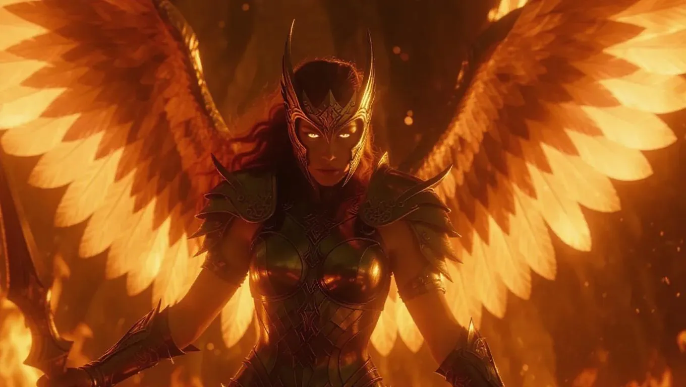A Valkyrie of fire protecting a fiery realm, her wings made of roaring flames, eyes glowing like molten gold, her spear igniting the battlefield below, epic fantasy, cinematic detail