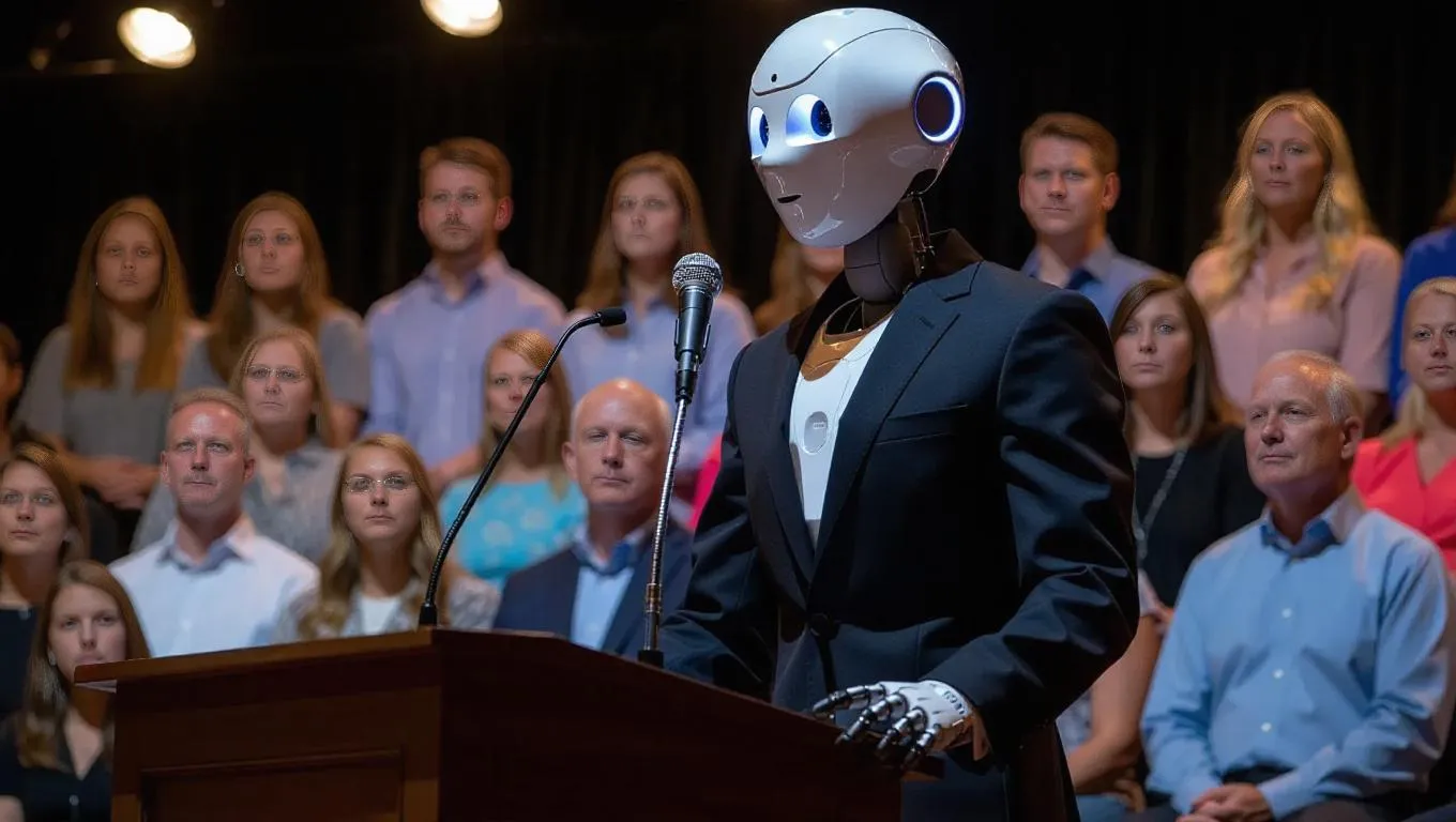 Generate AI campaign visuals of a futuristic male robot politician in a sharp 3-piece suit addressing Tennessee voters from a podium. VivaGO.ai crafts realistic political scenes with stage setups, microphones, and engaged crowds for next-gen campaign imagery or concept storytelling.