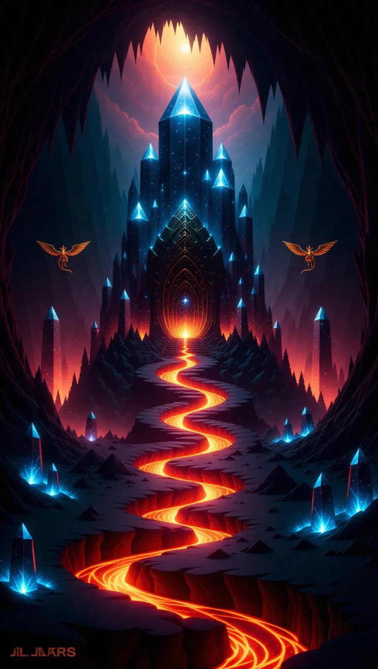 A vast underground world of glowing geodes and colossal crystal columns that hum with the planet’s heartbeat, lava flows of liquid ruby cutting through the darkness, winged serpents of gold and ice guarding hidden vaults filled with time-frozen relics and glowing orb-like lifeforms, creating an ethereal and mystical atmosphere.