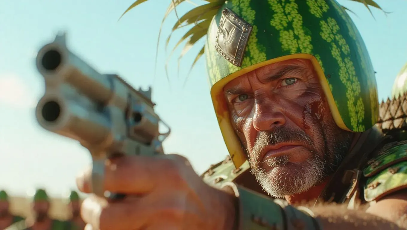 Generate a striking AI image of a battle-hardened warrior wearing a watermelon helmet, wielding fruit weapons (banana rifle, pineapple grenade, lemon shield) against a war-torn backdrop. Elevate creativity with Vivago.ai’s tools for vivid details, dramatic lighting, and professional-grade visuals. Transform text prompts into dynamic visuals with AI-powered precision.