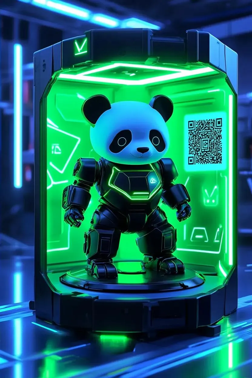 Discover a cyberpunk-inspired toy robot panda with matte black and neon green panels, showcased on a rotating platform in kinetic packaging. Featuring glowing geometric logos, unlockable QR codes, and blue-tinted industrial lighting, this high-tech design blends realism with cyberpunk aesthetics. Perfect for futuristic visuals, AI-generated art, or immersive game asset creation.