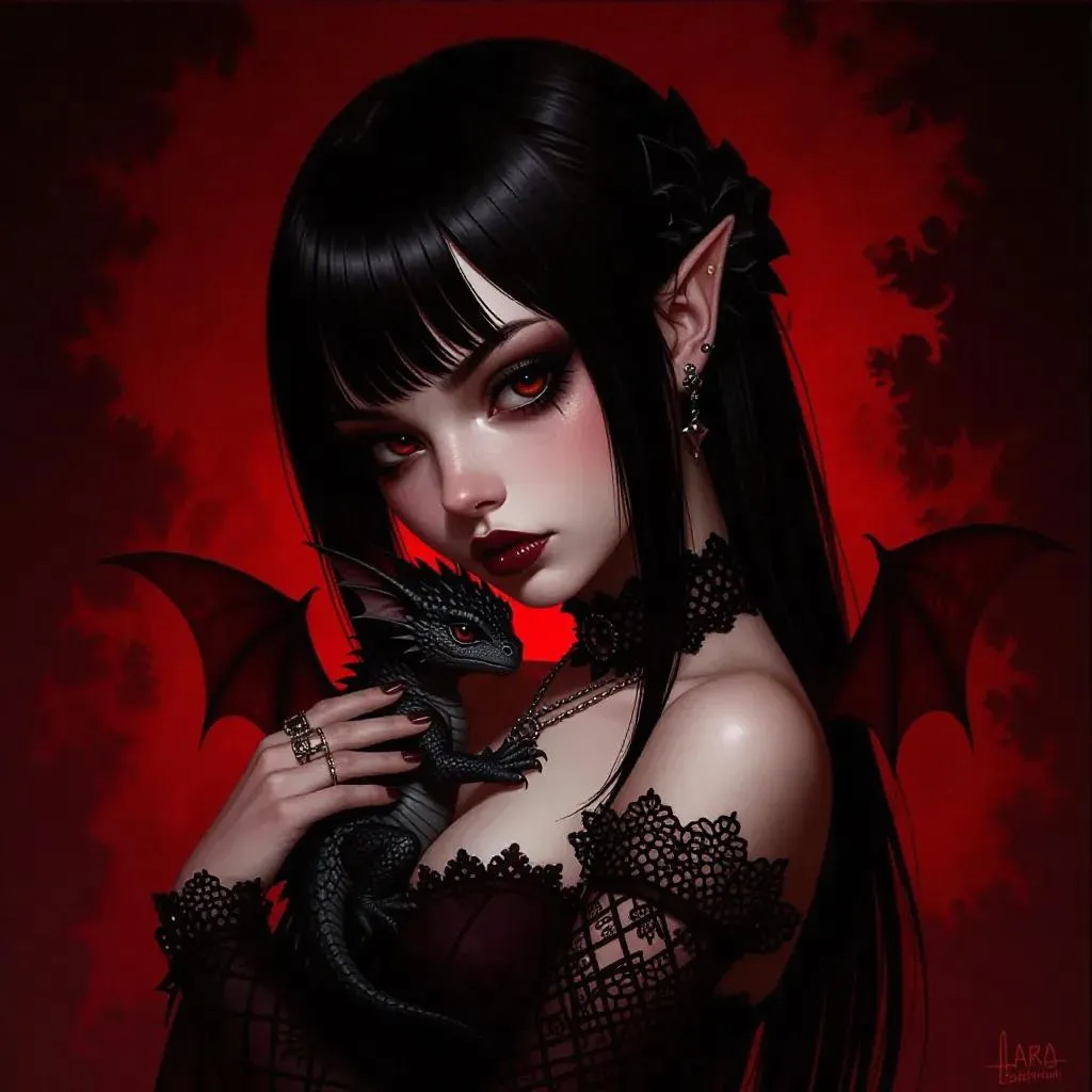 Generate a striking AI image of a pouty Black goth punk girl cradling a baby dragon, blending Amanda Clark's whimsy and Benjamin Lacombe's moody charm. Features maroon-black tones, dark ambiance, and edgy-cute contrasts. Explore Vivago.ai's AI tools for fantasy art with professional goth-punk aesthetics.