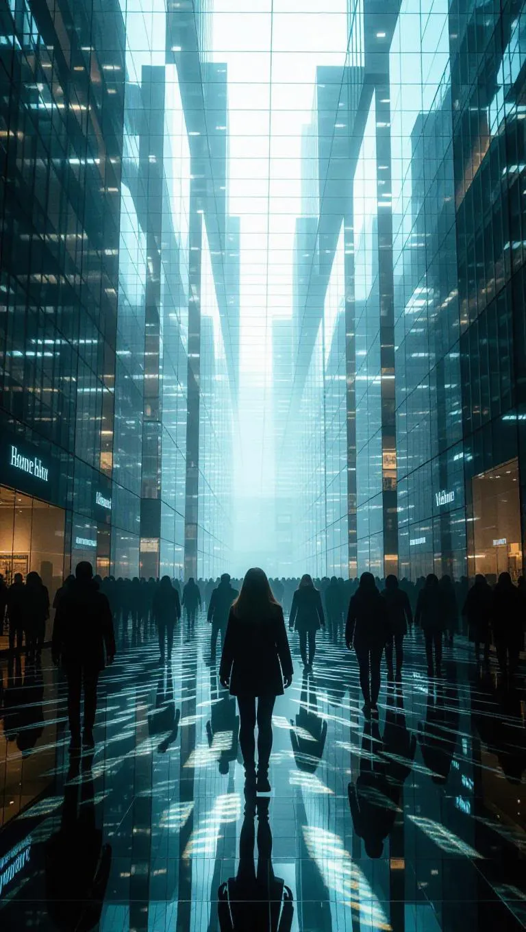 A vast region where time has crystallized, seconds hang in the air as frozen pulses. People navigate through shimmering layers of history like translucent panes of glass, each step shifting them between different versions of the present. Memory is a tangible landscape, not just a fleeting thought.