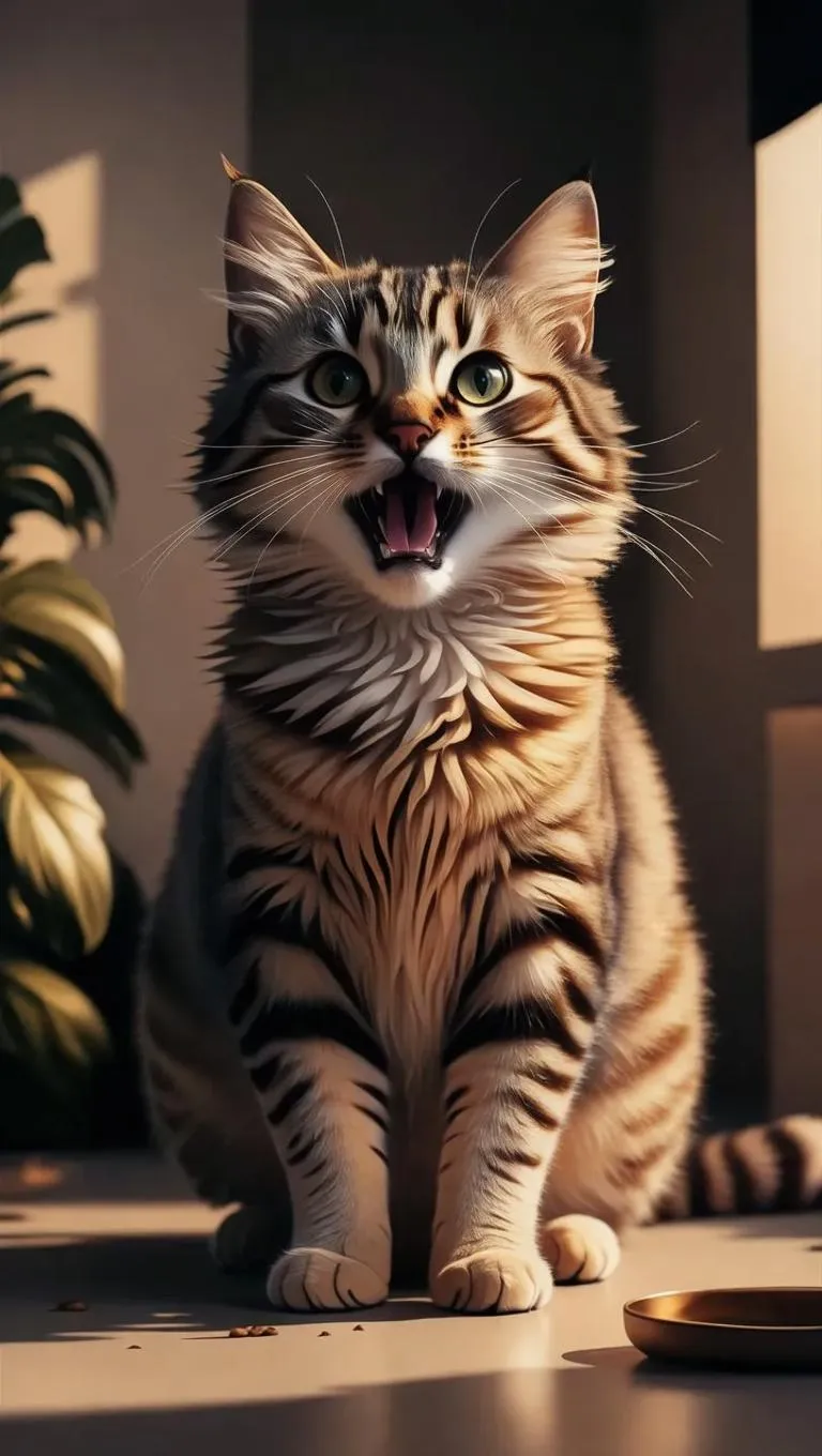 Generate a lifelike, vibrant AI image of an excited cat in full-front view with intricate textures and warm lighting. Vivago.ai's advanced AI tools create stunning, high-resolution visuals, highlighting the cat's zest against a minimalist backdrop. Perfect for professional-grade creative projects and realistic digital art transformations.