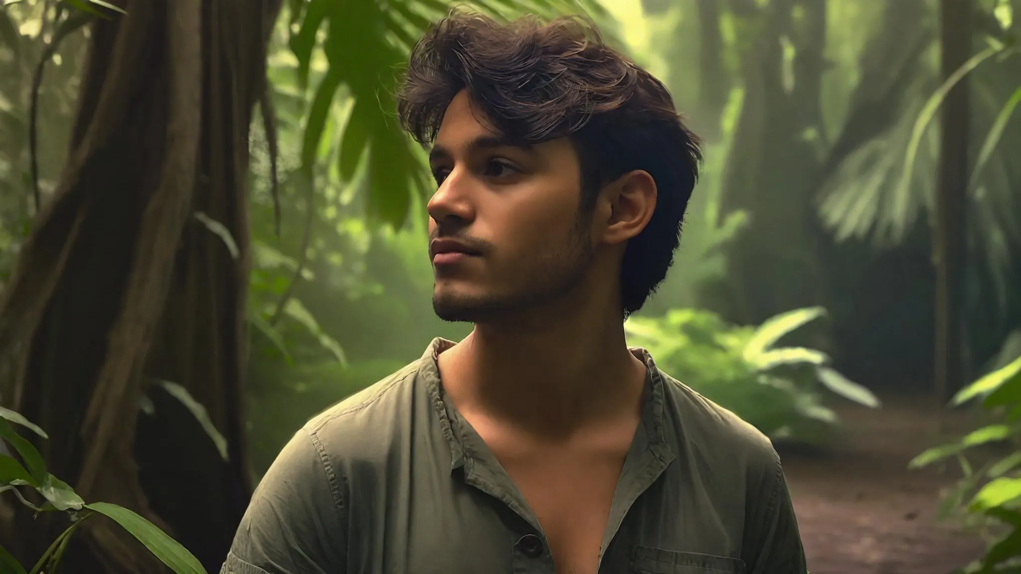 Generate hyperrealistic 3D renderings of a casual male figure against an aged wall, blending gouge-textured surfaces with lush rain forest foliage. AI-powered tools craft dramatic backlight, medium hair details, and gloomy atmosphere in close-up POV compositions. Ideal for hyperrealistic scenes merging urban decay and natural overgrowth with cinematic precision.