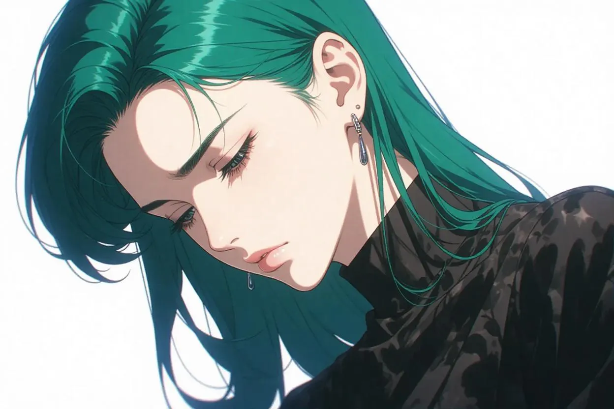 Create exquisite AI anime art capturing sadness with moody lighting. Experience timeless beauty in 1980s neo pop style: dark emerald palette, whippash curves, intricate details. Generate nostalgic wallpapers featuring directed poses, soft shadows, and sensitive stillness using VivaGO.ai's AI art tools. Perfect atmospheric down shots.