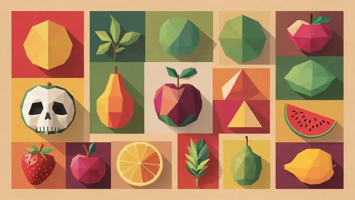 Create minimalist geometric still life art featuring fruits and food using squares, triangles, circles. Vivago.ai's AI transforms text prompts into abstract compositions with basic shapes, offering curated effects for sleek, modern still life visuals. Generate AI art with clean lines and simplicity.