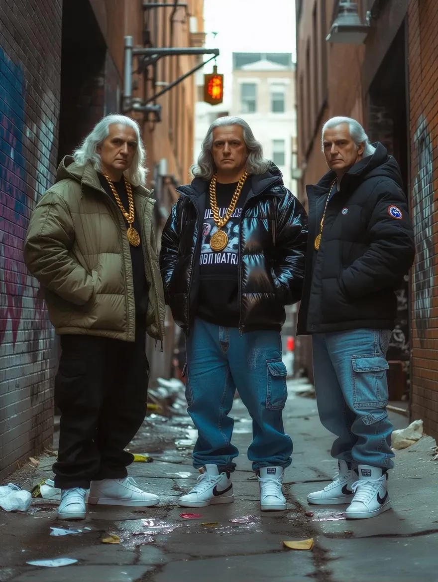 Hyper-realistic AI-generated image reimagines Benjamin Franklin, George Washington, and Thomas Jefferson in modern streetwear—hoodies, puffer jackets, gold chains—posing in a graffiti-tagged NYC alley. Moody lighting highlights textured fabrics, weathered concrete, and historic-meets-urban expressions. Vivago.ai blends 18th-century icons with 21st-century street culture through AI image generation, creating bold surreal contrasts and gritty visual storytelling.