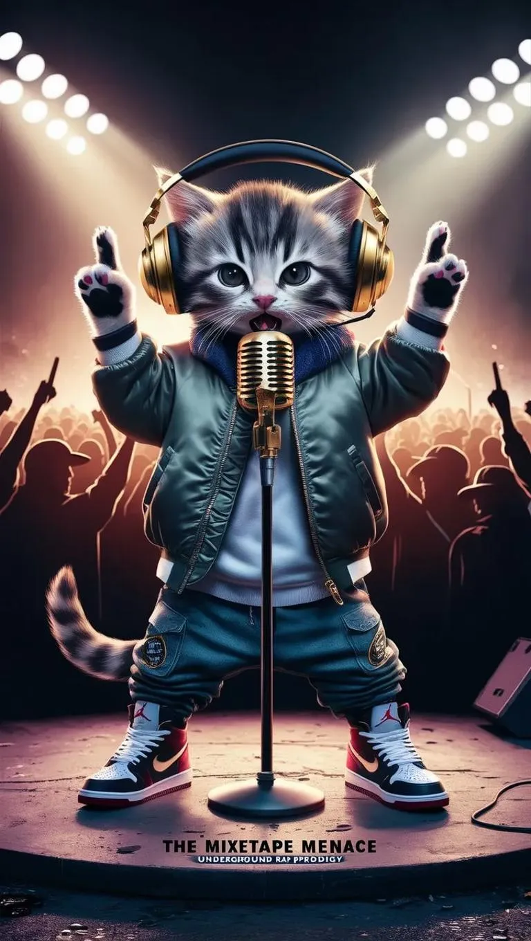 Experience the underground rap prodigy kitten spitting legendary bars in hyperrealistic 16K resolution. This fierce AI-generated image features a mic-gripping, bomber-jacket-clad kitten throwing gang signs on a neon-lit street stage, backed by a roaring crowd. Ultra-high clarity captures Air Jordans, gold headphones, and flashing lights for unmatched visual storytelling in AI art.