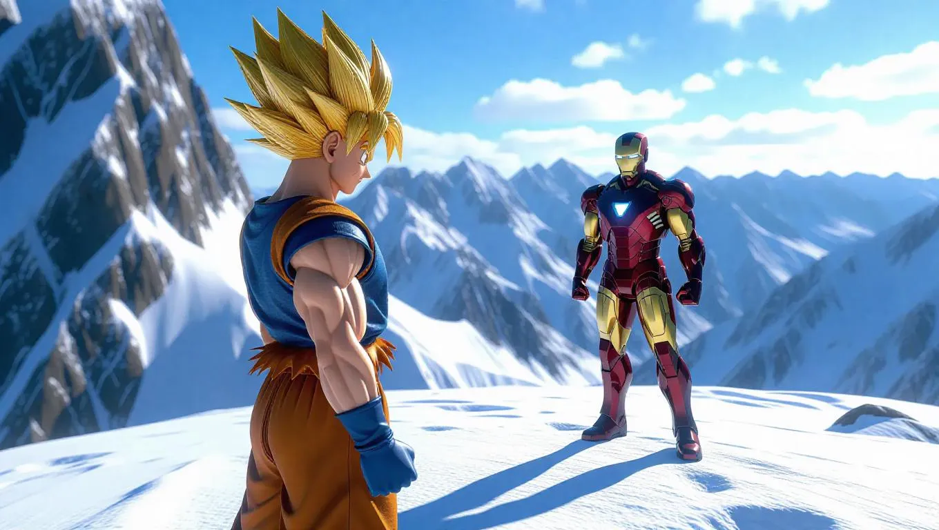 Goku in Super Saiyan Third Form stands on a snowy mountain peak, his golden hair glowing brilliantly. He gazes intently at Iron Man, who stands confidently nearby. The snowy landscape is bathed in cool, afternoon sunlight, casting long shadows and highlighting the snow's surface. The sky is bright blue, with a few wispy clouds. The lighting is sharp and clear, creating a strong contrast between highlights and shadows. The style is hyper-realistic, emphasizing the muscular physiques and focused expressions of both characters.