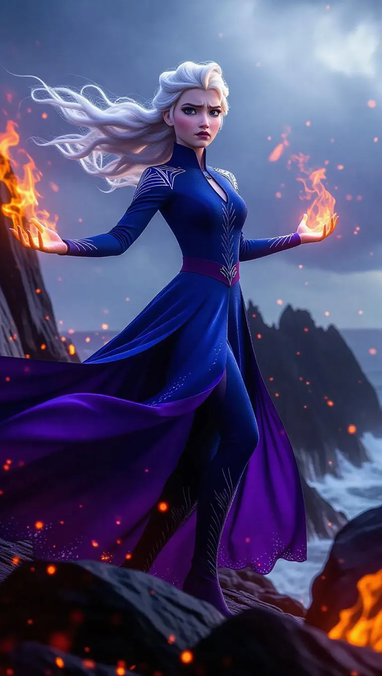 Elsa, with her icy blue hair transformed to deep purple hues, stands boldly on a stormy cliffside. She wears a fitted, navy blue dress with shimmering silver accents, her arms outstretched as she conjures swirling flames. Dark storm clouds and jagged rocks surround her, adding to the fierce, turbulent atmosphere. The sky is a tempestuous grey, with flashes of lightning. Front light highlights her fierce gaze, while side light accentuates the vivid movement of the flames. The style is a harmonious blend of realism and epic fantasy, showcasing the strength of a tempest mage.