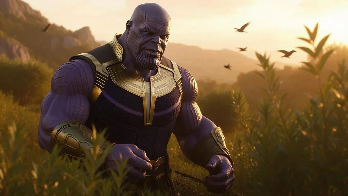Thanos, dressed in a rugged, green adventurer's outfit, cultivates a raw wilderness filled with wild, untamed plants. He waters hardy shrubs, his large hands skillfully managing the rough terrain. Birds chirp around, bringing a sense of harmony. The wilderness is drenched in soft, golden hour light, offering a warm embrace. The scene is earthy and wild, contrasting Thanos's usual intimidation with an exploration theme.