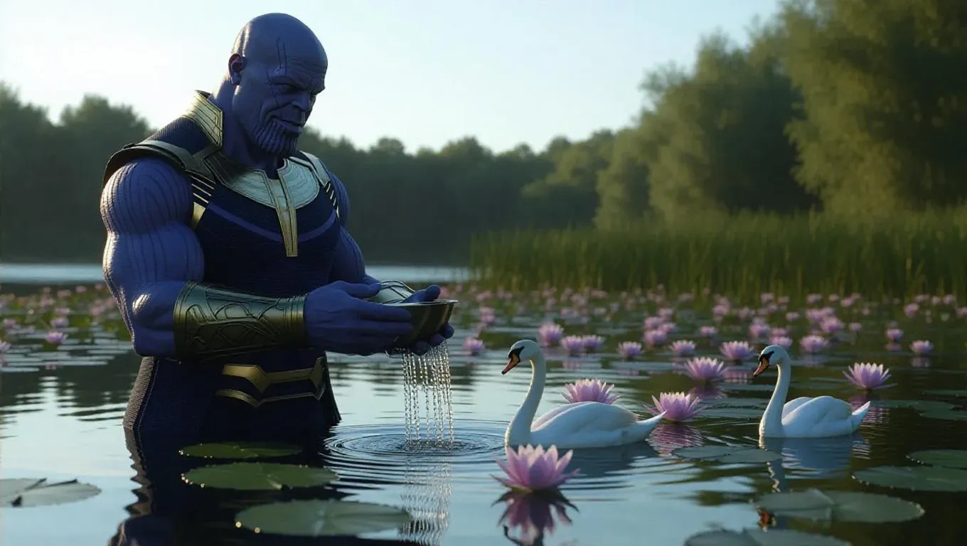 Thanos, dressed in a loose linen outfit, cultivates a peaceful lakeside garden filled with tranquil water lilies. He waters delicate blossoms, his large hands surprisingly gentle. Swans glide across the water, enhancing the soothing environment. The lakeside bask in soft, early morning light, creating a serene feeling. The scene embodies calmness and serenity, contrasting Thanos's typical menace with peace.