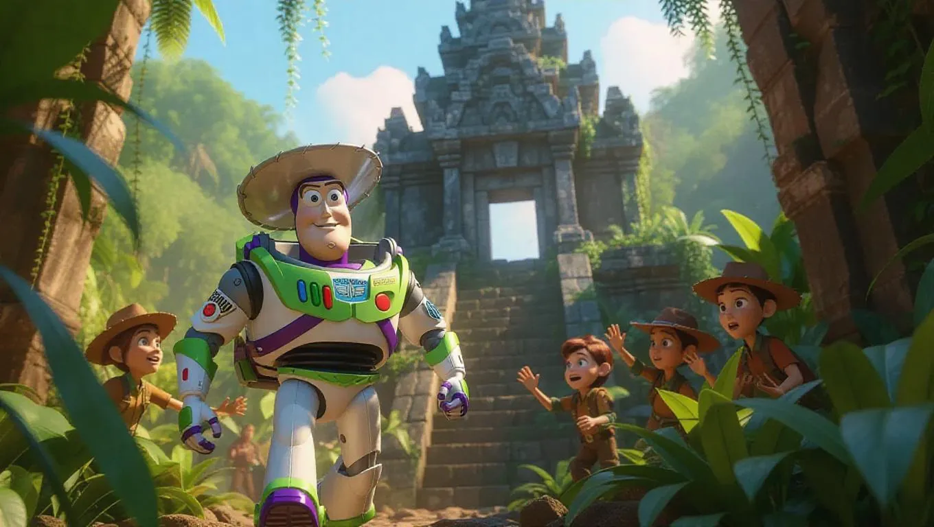 Buzz Lightyear, equipped in rugged explorer gear, treks through a dense jungle, pacing towards a hidden temple in an adventurous expedition. His wide-brimmed hat bears a distinctive star emblem, and his backpack sways dramatically with each step. The team is animated with excitement, waving maps and exclaiming from the undergrowth. An ancient ruin rises in the background, its overgrown vines and crumbling stones adding to the mysterious atmosphere. Dappled sunlight filters through the canopy, creating vibrant shadows on the explorers and the foliage, generating a scene of discovery and wilderness wonder.