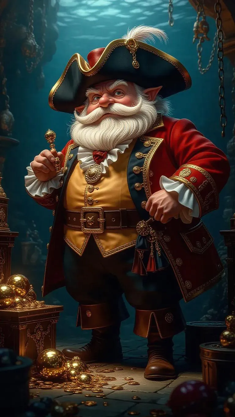 A baroque oil painting in 8K resolution captures Mr. Krabs as a greedy merchant, dressed in elaborate pirate-inspired 18th-century attire. He stands beside a pile of treasures, his expression shrewd and calculating. The underwater setting is highlighted with glimmers of gold, creating a luxurious yet tense atmosphere. The scene is rendered in a rich, detailed baroque style, emphasizing the contrast between Mr. Krabs' avarice and the opulence surrounding him.