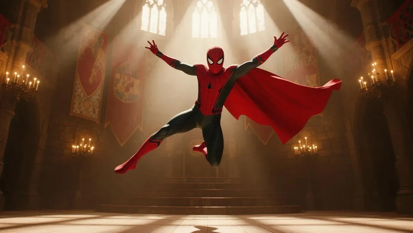 Spider-Man, dressed in a medieval knight costume with a flowing cape and a red mask, performs a mid-air joust on an ancient stage. His muscles are taut, capturing the dynamic tension of his leap. The theater is adorned with stone walls and tapestries, creating an elegant backdrop. Dramatic spotlights cast a mix of warm and cool candlelight effects, highlighting his form and casting long shadows, enhancing the theatricality of the scene. The style blends the realism of Spider-Man's superhero physique with the chivalry of medieval tales.