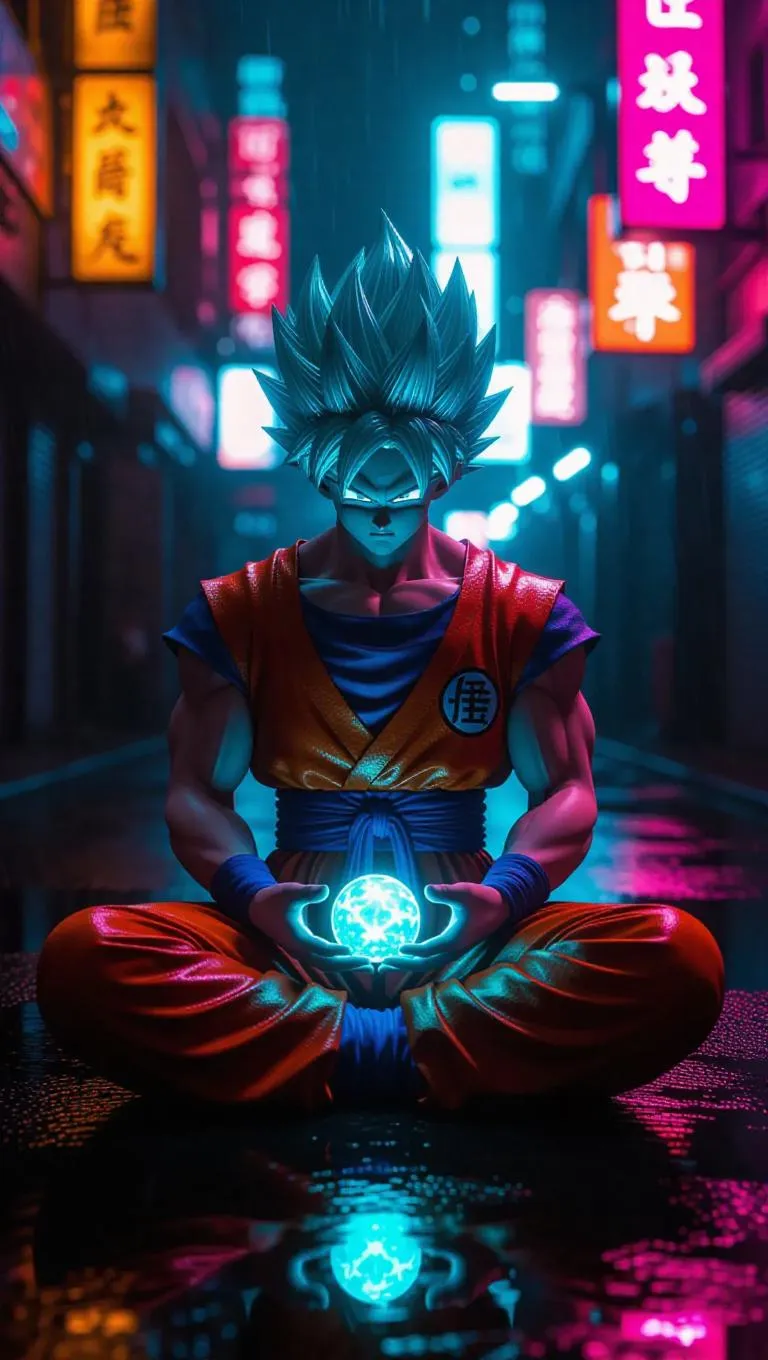 Goku meditates alone in a neon-lit cyberpunk alley, his hair a glowing turquoise. His futuristic suit shimmers as holographic Dragon Balls whirr around him. Bright neon colors clash wildly, creating an exciting and dynamic atmosphere.