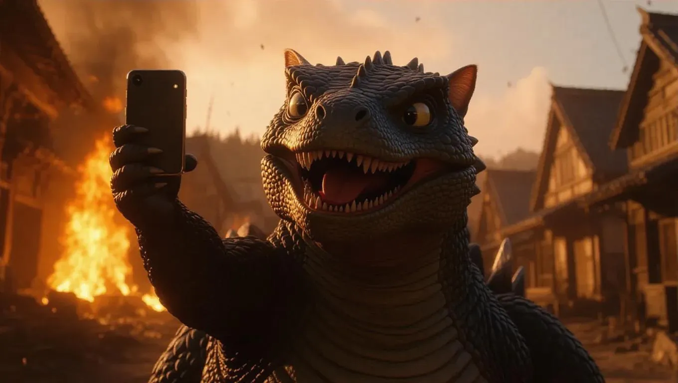 A photorealistic 8K quality scene captures a kitten riding on the shell of the monstrous Gamera, who is breathing fiery flames. The kitten, with a mischievous expression, takes a selfie with a smartphone. The background shows a quaint village, with houses on fire and smoke swirling above. Soft, warm light casts dramatic shadows, enhancing the comical yet chaotic atmosphere. The style is hyper-realistic, blending humor with destruction.